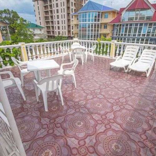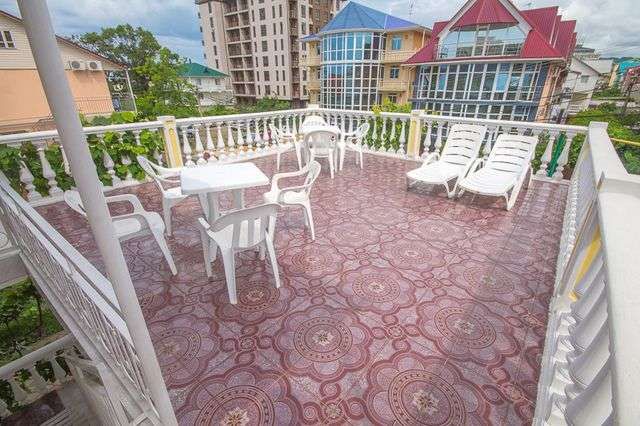 На первом этаже гостевого дома для удобства отдыхающих оборудована общая кухня, на втором и третьем этажах находятся обустроенные террасы для отдыха, обвитые виноградом, на третьем этаже располагаются шезлонги